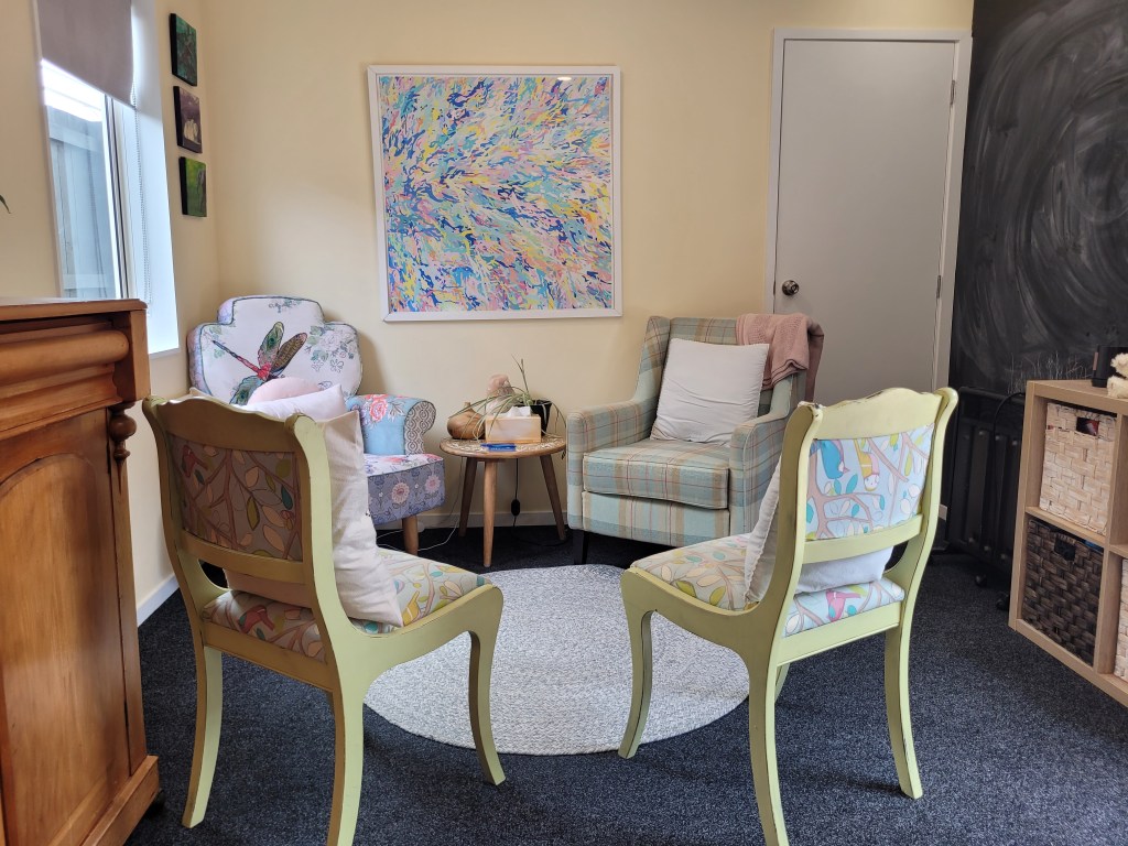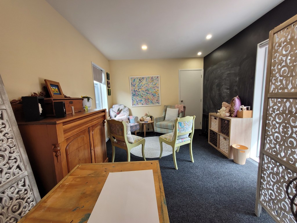 We have 3 counselling rooms, I mainly use the larger room as pictured, which also has access to an art table, sand tray, and toys. We have a waiting room with a few snacks, water, and coffee. There is plenty of street parking.